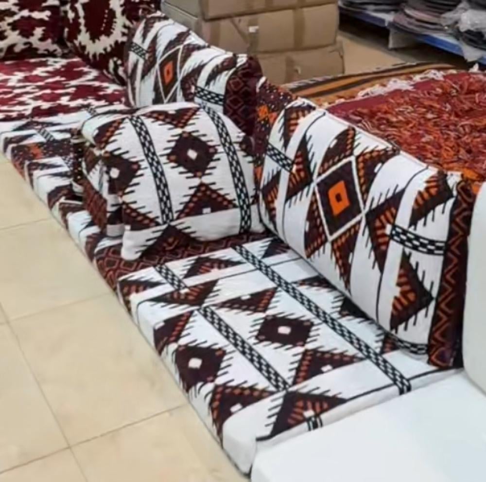 طقم جلسة أرضية بطول 200 سم مصنوع من قماش حجازي المعروف بجودته العالية ولمسته التراثية الأنيقة. يتميز الطقم بتفاصيله التقليدية المتناسقة، مما يجعله مثاليًا للمجالس، الاستراحات، أو الرحلات البرية.